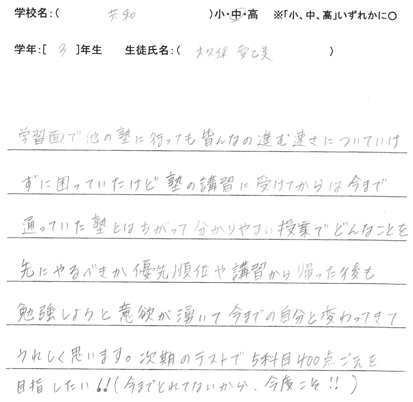 学習面で他の塾に行ってもみんなの進む速さついていけずに困っていたけど、塾の講習にを受けてからは今まで通っていた塾とはちがって分かりやすい授業で、どんなことを先にやるべきか優先順位や、講習から帰った後も勉強しようと意欲が湧いて、今までの自分と変わってきてうれしく思います。次期のテストで5科目400点ごえを目指したい!!(今までとれていないから、今度こそ!!)