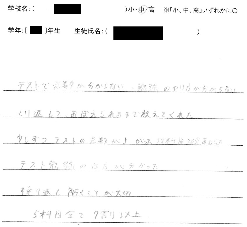 テストで点数が上がらず、勉強のやり方が分からなかった。くり返して、おぼえられるまで教えてくれた。少しずつテストの点数が上がり理科は30点上がった。テスト勉強の仕方が分かった。繰り返し解くことが大切。次のテストで5科目全て7割以上取る。