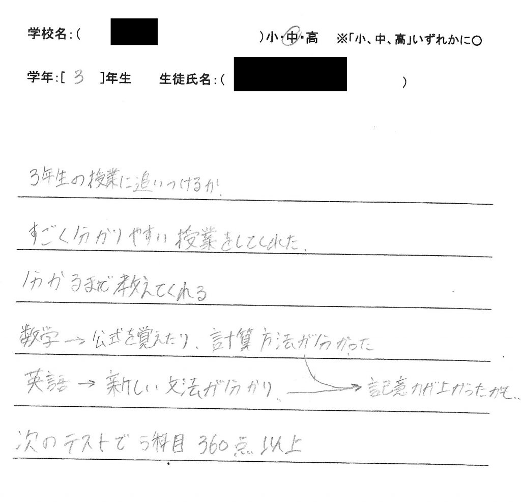 3年生の授業に追いつけるか心配でした。すごく分かりやすい授業をしてくれました。分かるまで教えてくれます。数学では公式を覚えたり計算方法が分かった。英語では新しい文法が分かった。記憶力が上がったかも。次のテストで5科目360点以上が目標です。