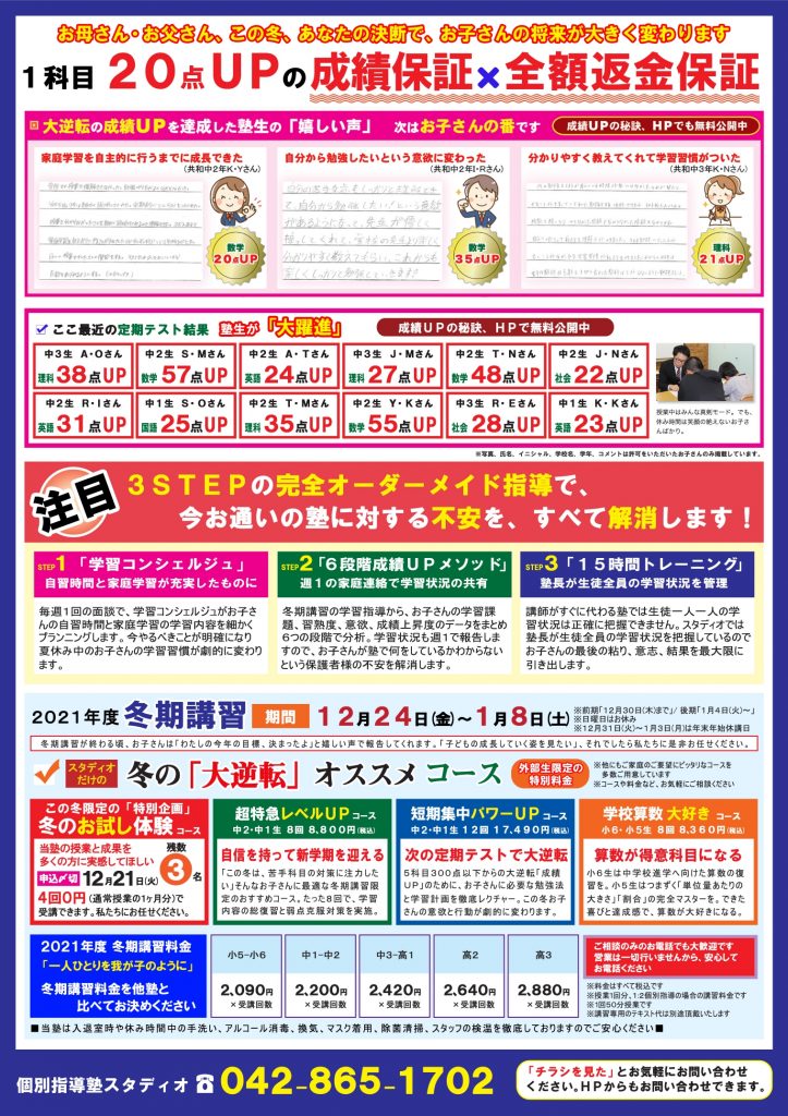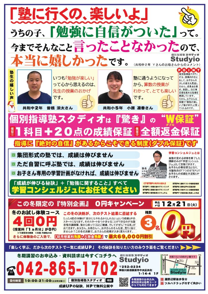 この機会で「受験対策」「弱点克服」「三学期準備」といった目的で、ぜひともスタディオの冬期講習をご活用ください!